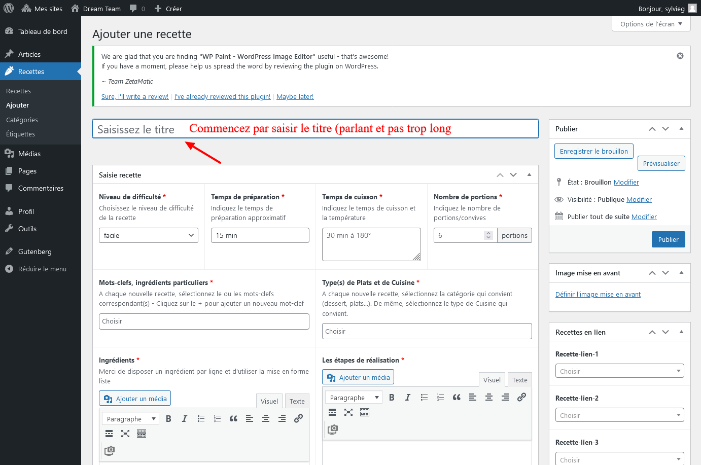 Ne pas oublier de remplir « Image en avant » il faudra téléverser (envoyer) une photo de votre recette.