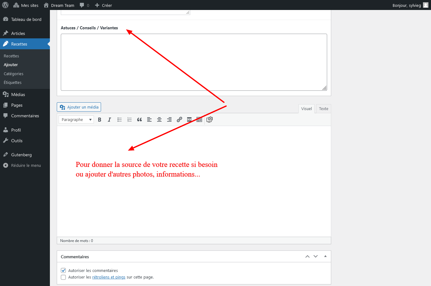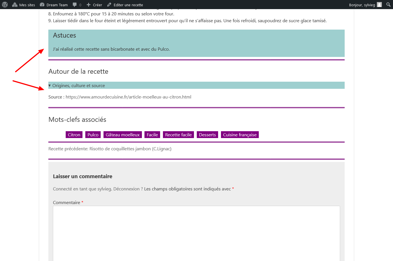 • une autre zone pour indiquer la source de votre recette, ajouter d’autres photos et ce que vous voulez…