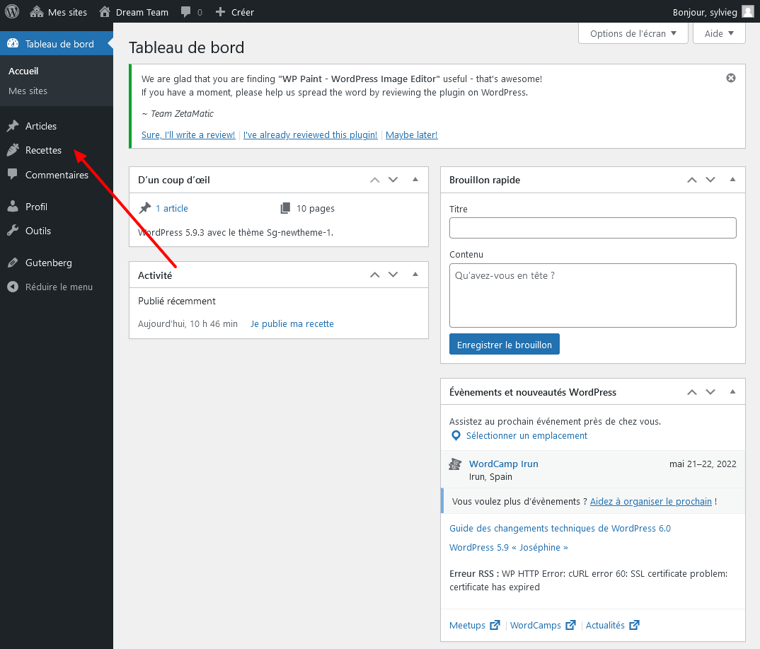 Vous découvrez la partie d’administration. Sur la gauche, le menu qui arbore une partie Recettes sur laquelle vous allez cliquer.