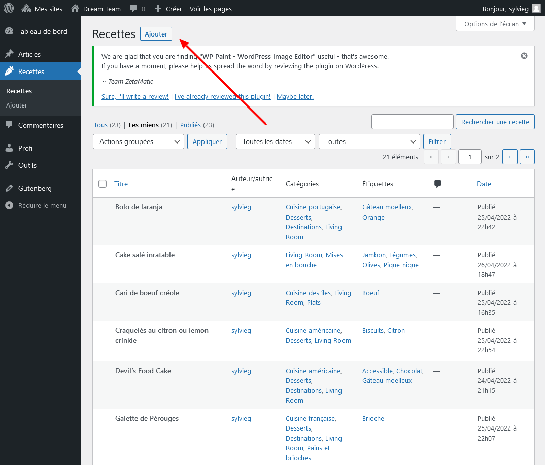 Pour publier 1 nouvelle recette, cliquez sur le bouton ajouter.