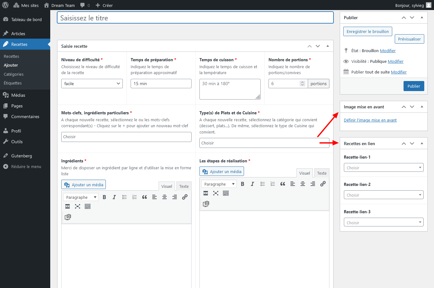 Pour la partie recettes en lien (sélectionnez les recettes proches de la vôtre (ingrédients ou type de recette similaire)